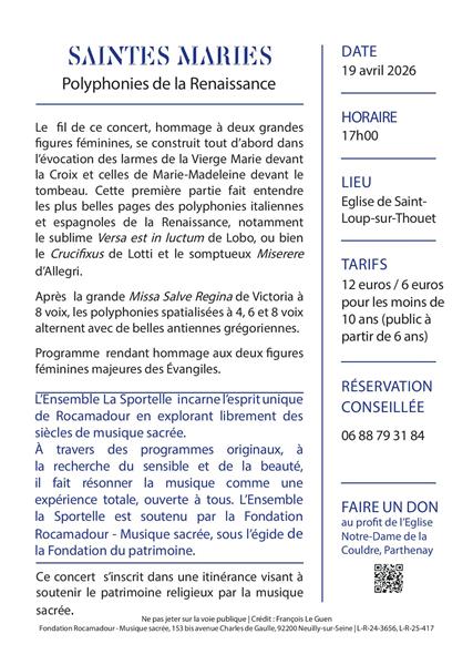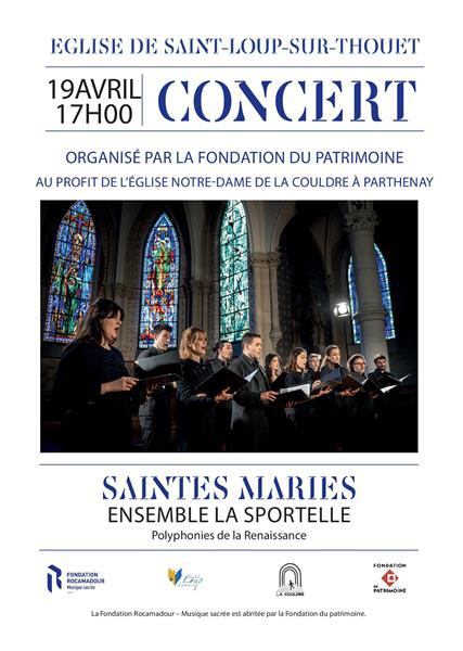 La fondation du patrimoine propose un concert en l'église de Saint-Loup-sur-Thouet, au profit de l'église Notre-Dame de la Coudre à Parthenay. Saintes Maries, ensemble la sportelle, polyphonies de la Renaissance. Réservation conseillée au 06 88 79 31 84. Tarifs : 12 € et 6 pour les moins de 10 ans (concert conseillé à partir de 6 ans).